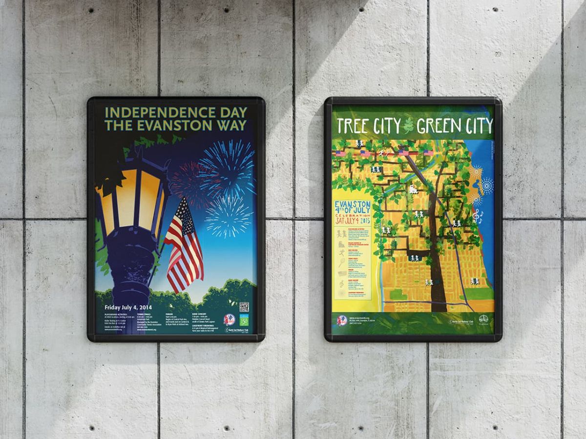 The poster for this year's Fourth of July Celebration showcased Evanston as an official "Tree City," featuring a hand-drawn map adorned with trees and illustrations of scheduled festivities. These included a grand parade, a fun run, children's games, and a concert with fireworks. The map provides a bird's-eye view of the day and night excitement. This concept offers a playful interpretation of Evanston's map, transforming streets into an abstract representation of a tree, where leaves overlap, and parks indicate 4th of July activity locations. A map key uses icons to pinpoint the various festivities.