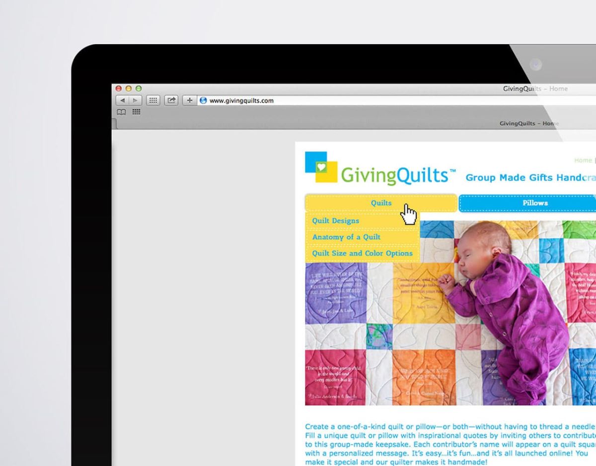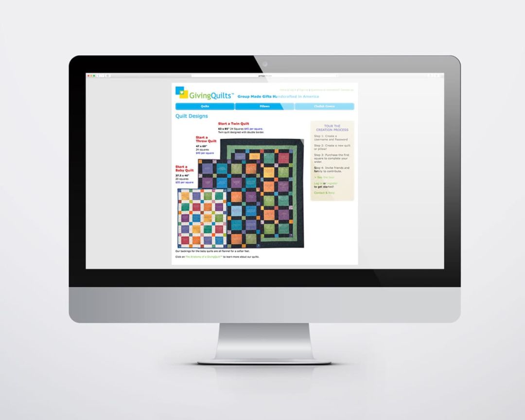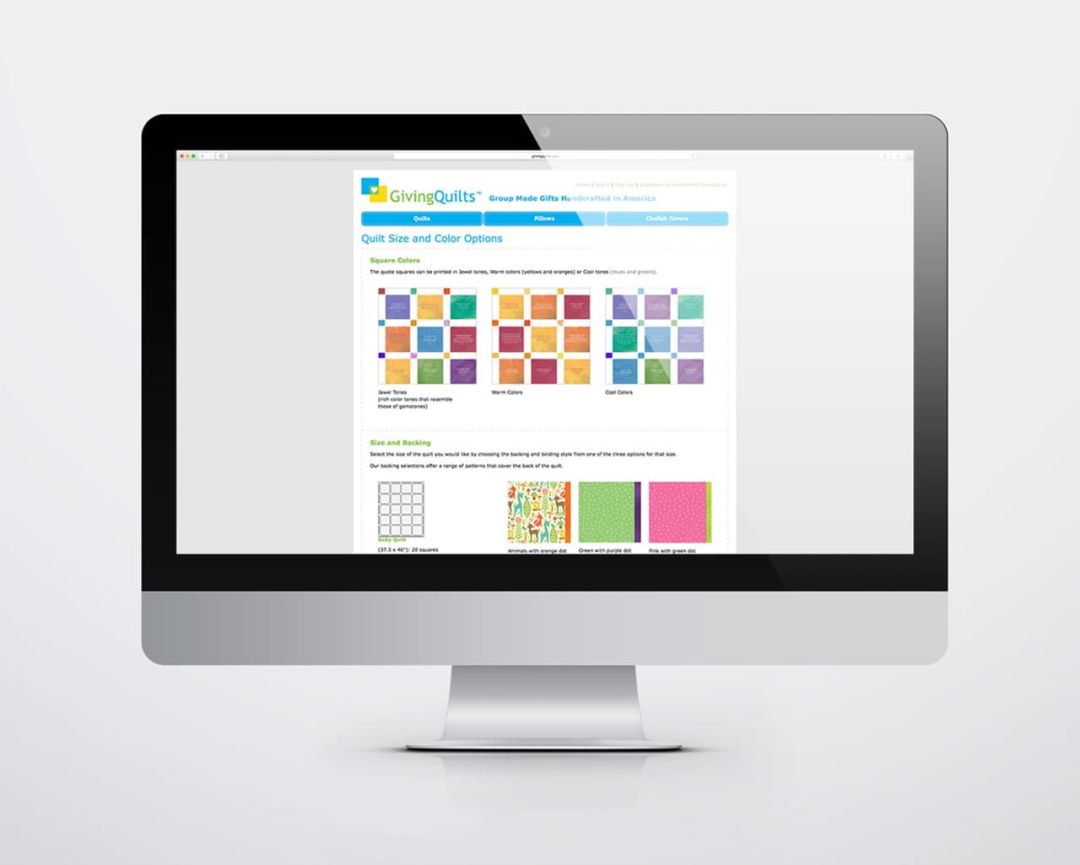 GivingQuilts is a website designed and developed by NeigerDesign, featuring online “social quilting” which facilitates group creation of quilts and pillows. GivingQuilts are made with inspirational quotations printed on quilt squares submitted by 20-24 individuals (each person pays by the square).