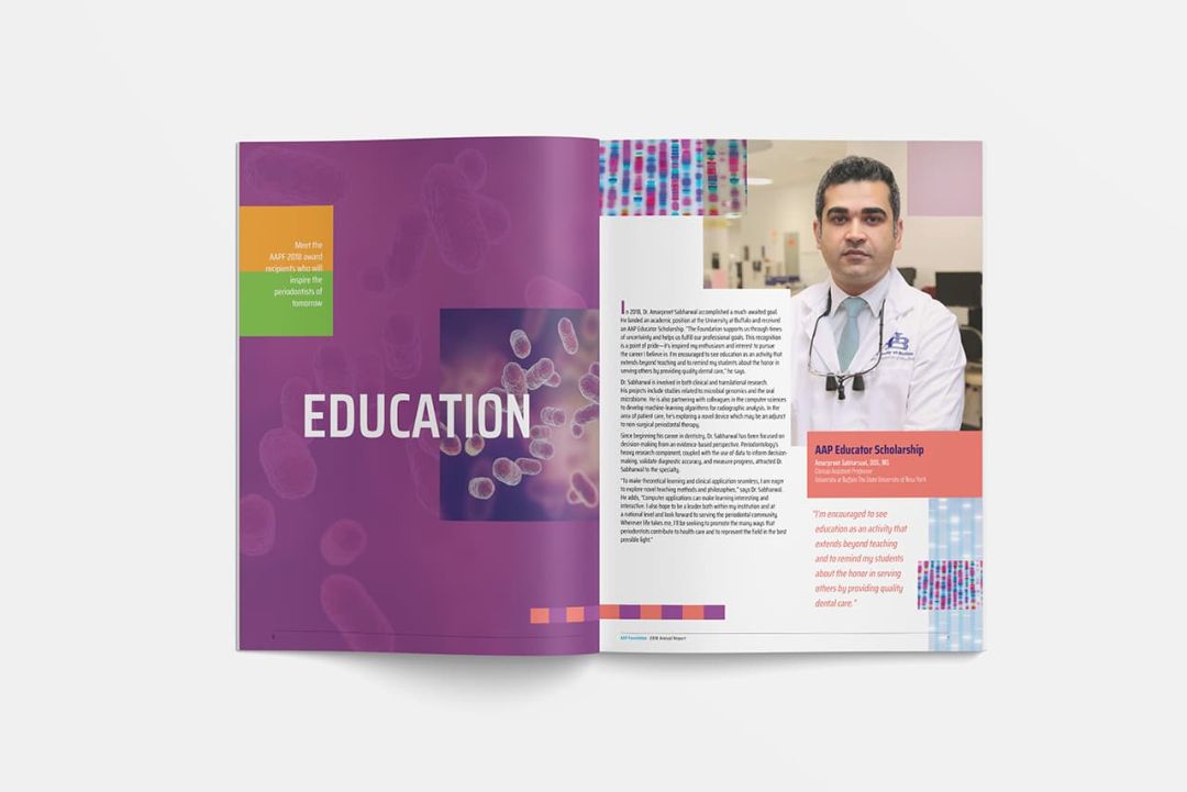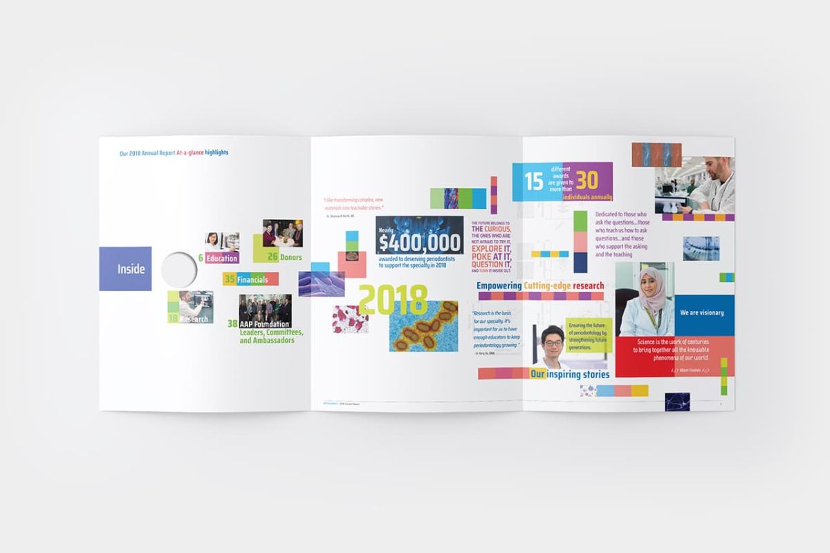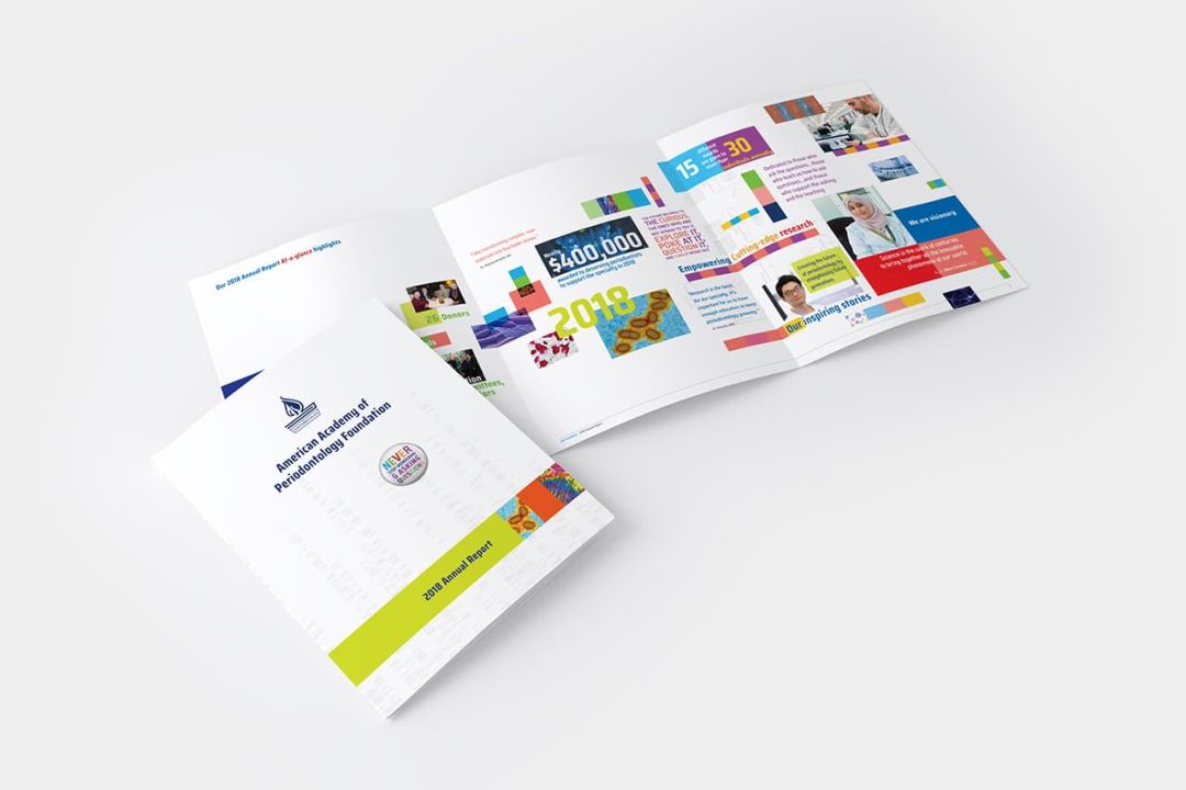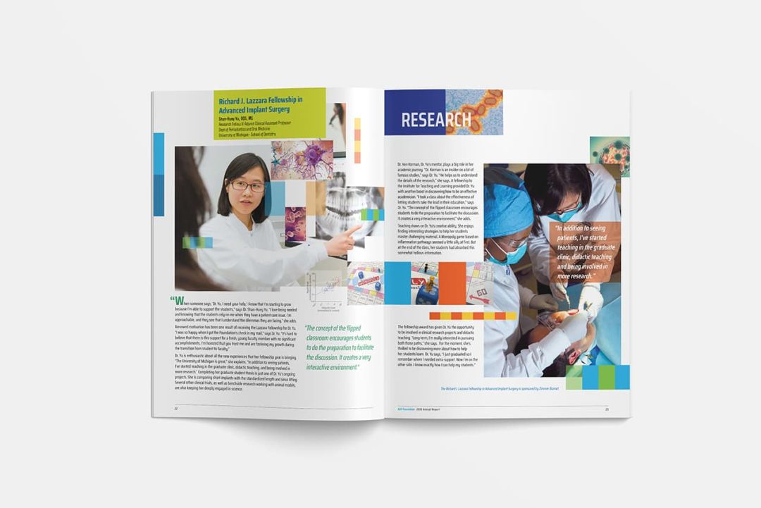 The American Academy of Periodontology Foundation's (AAPF) mission is to improve the periodontal and general health of the public through increasing public and professional knowledge of periodontal diseases, stimulating research to generate new knowledge, and enhancing educational programs in periodontal education and practice. We have created Annual Reports for AAPF for more than a decade. Each year presents an exciting challenge to create a relevant and inspiring theme.